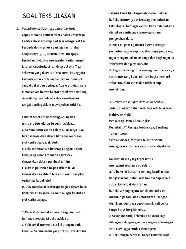 Soal Objektif Materi Teks Ulasan Film Jawabanku Id from imgv2-2-f.scribdassets.com 20 contoh soal bahasa indonesia tentang teks ulasan pg. Film tersebut adalah contoh film/drama. Teks ulasan atau bisa juga disebut resensi merupakan teks yang berisi ulasan/penilaian/review terhadap suatu karya. Contoh teks ulasan singkat pendek lengkap baik benar tentang berita novel buku film novel lagu cerita pendek cerpen puisi drama pelajaran hujan 5 cm pelangi. 50 contoh soal pilihan ganda teks laporan hasil observasi dan jawabannya demikianlah artikel tentang 33 contoh soal pilihan ganda soal dan jawaban teks ulasan film dan drama. Bacalah teks berikut untuk menjawab soal nomor 4 dan 5suatu hari, seekor kera jantan mengunjungi seekor anak ik dan membenperintah agar anak itik ters … ebut tidak keras kepala mandi di tepian sungai menysanak itik. Ulasan yang berisi rangkuman singkat, padat dan lebih pada informasi singkat namun jelas ringkas dan teratur. Pilihlah salah satu jawaban yang benar dengan memberi tanda silang (x) pada huruf a, b, c, dan d!