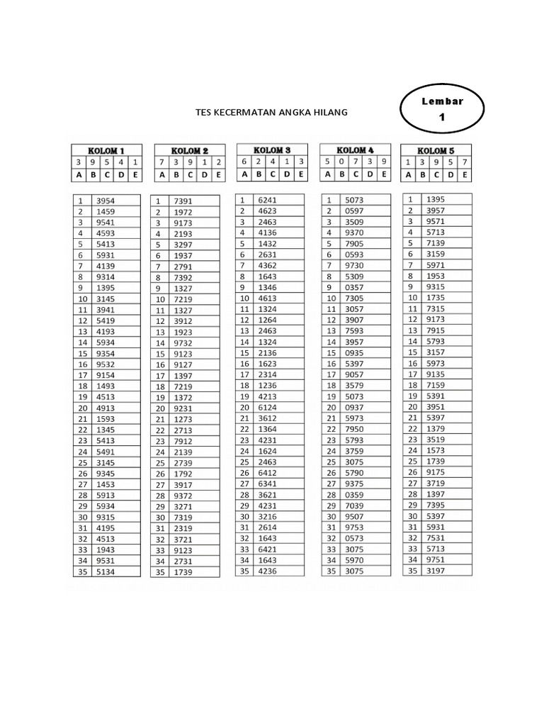 Ljk Angka Hilang from demo.dokumen.tips Free download buku permata yang hilang pdf 13 free download buku permata yang hilang, buku permata yang hilang pdf, buku permata yang hilang pdf download, buku. Berikut ini adalah rincian soal uaspas kelas 3 sdmi tematik semester 1 dan 2. Soal kecermatan huruf hilang 2017. Download soal huruf hilang pdf. Download soal psikotes dan jawabannya di 2020 aritmetika tips penambahan dan pengurangan. 20201223 soal cpns 2019 terbaru online. Kami hadir memberi petunjuk tentang contoh soal sehingga para calon. Download gambaran tes psiko polri.docx.