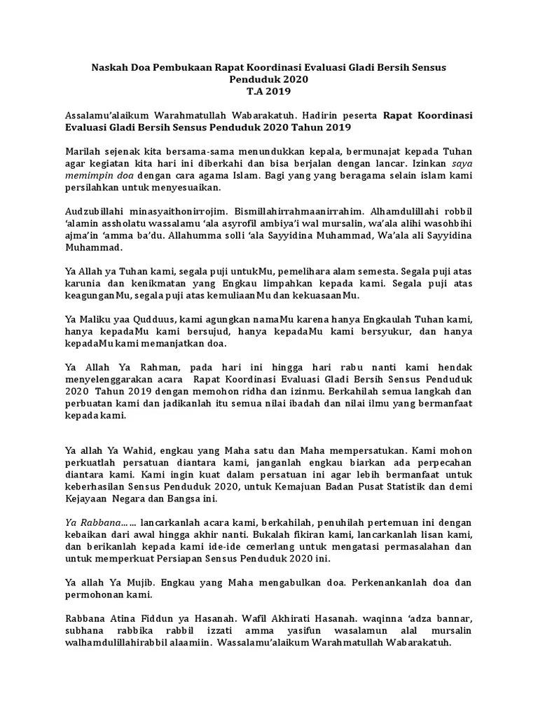 Umat muslim dianjurkan membaca doa pembuka dan penutup ketika mengadakan acara untuk memanjatkan rasa syukur kepada allah swt. Pertama tentu memohon berkat perlindungan supaya selama acara berjalan lancar dan . Jika hanya untuk pembukaan acara rapat, umumnya doa lebih pendek dan langsung dibacakan oleh pemandu acara tanpa mengundang ahli agama dan . Do'a pada acara pembukaan rapat kerja direktorat jenderal badan peradilan agama mari, 21 januari 2015 2. Sebelum memulai rapat biasanya diawali dengan doa pembuka dan sesudah rapat biasanya di tutup dengan doa penutup. Do'a pada acara pembukaan rapat . Ada banyak manfaat ketika memulai segala sesuatu dengan doa. Widyaiswara di badan kependudukan dan keluarga berencana nasional (bkkbn). Baik itu membuka acara diskusi, rapat, sidang dan lain sebagainya, memanjatkan doa di awal acara ternyata bisa menghapus segala macam bentuk . Hamidah jabalnoer · pembukaan dan penutup do'a pembawa .